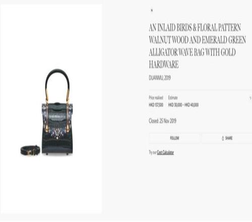 2019年,佳士得拍賣行拍出了一隻端木良錦的迷你細木鑲嵌手袋,預估價2-3萬,最終以13.75萬港元成交,讓這個牌子在小範圍內一戰成名,被稱為“中國的奢侈品牌”。