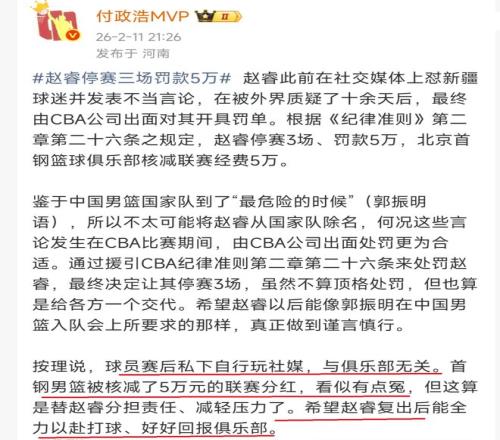 至於為何要處罰趙睿,原因就是,2月1日,北京隊與青島隊的比賽之後,趙睿在網絡上回應了新疆隊球迷的吐槽,從趙睿所言來看,完全就是不經大腦的發言。這也是引起了很多新疆隊球迷的不滿。
