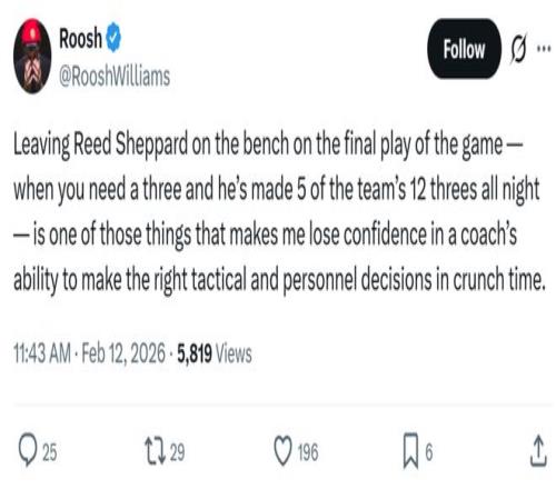 RooshWilliams寫道:“當球隊關鍵時刻落後3分時,烏度卡將整晚命中了全隊12記三分球中5個的謝潑德摁在板凳席,這種決策讓我對教練在關鍵時刻做出正確戰術和人員調整的能力失去了信心。”