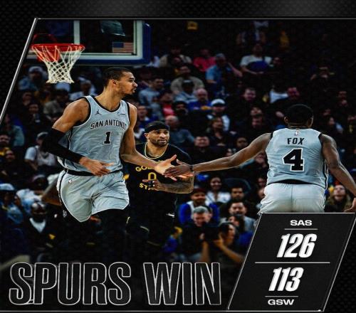 文班亞馬助攻福克斯跳投得分,格林回敬遠投。格林搶斷福克斯,隨後助攻波傑姆斯基籃下得手。分差僅為7分,勇士看到贏球希望。凱爾登約翰遜強攻禁區得手,格林失誤,文班亞馬2罰全中。格林再次失誤,福克斯暴扣。桑德斯遠投不進,比賽時間走完。最終,馬刺以126比113力擒勇士,得以上演16分逆轉好戲。聖安東尼奧豪取6連勝,鞏固了西部第2的排位。勇士末節以19比32落後,慘遭翻盤。