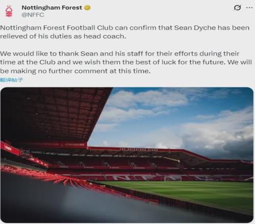 官方:諾丁漢森林宣布解雇了肖恩-戴徹,這名教練僅僅上任了4個月左右。