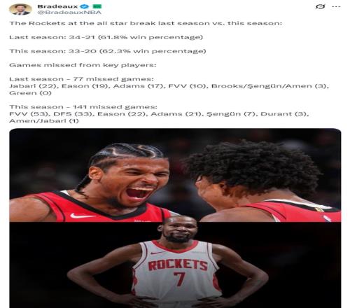 火箭記者Bradeaux曬出了一項數據對比,他認為杜蘭特的加盟並沒有讓火箭更壞,火箭本賽季的戰績沒有達到外界的理想預期跟傷病有關。