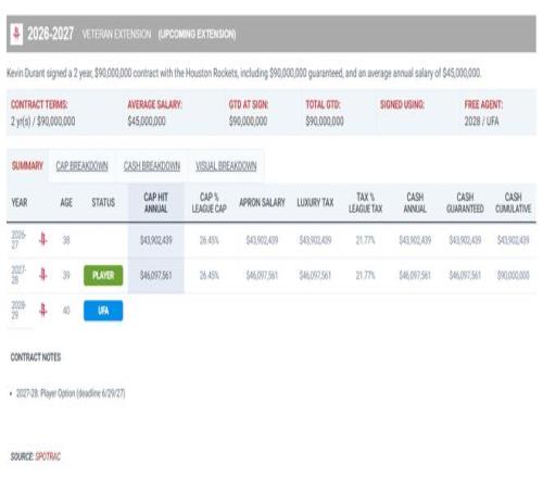 杜蘭特此前與火箭隊達成了兩年9000萬的提前續約,他本賽季的薪水是5470萬,26-27賽季4390萬,27-28賽季4609萬(球員選項),這份合同結束後他因為38歲條款就隻能一年一簽,他的薪資也必然會迎來大幅度的下滑,因為這份合同執行完他就39歲(也有可能退役)。