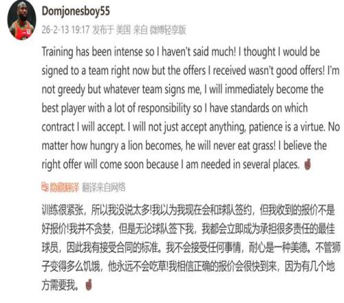 到目前為止,瓊斯都沒有獲得一份合同。其實在過去一段時間,瓊斯在NBL打球,後續回到美國養傷。無奈這波養傷之後,瓊斯並沒有回歸到CBA。根據他曝光的動態來看:我以為我現在會和球隊簽約,但我收到的報價不是好報價!這樣的話語已經非常明顯了,他之所以沒有回到CBA,就是因為薪資沒有到位,所以他始終都沒有談妥。
