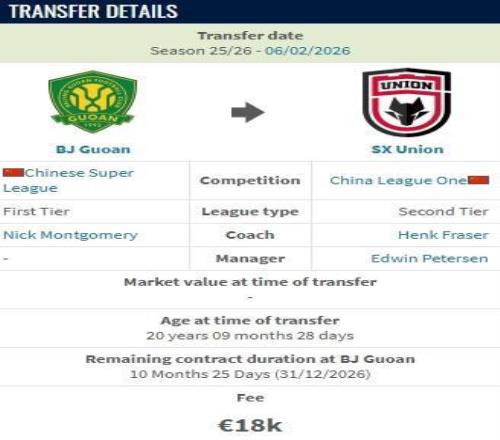 德轉顯示,王宇翔從北京國安加盟陝西聯合的轉會費約15萬人民幣。