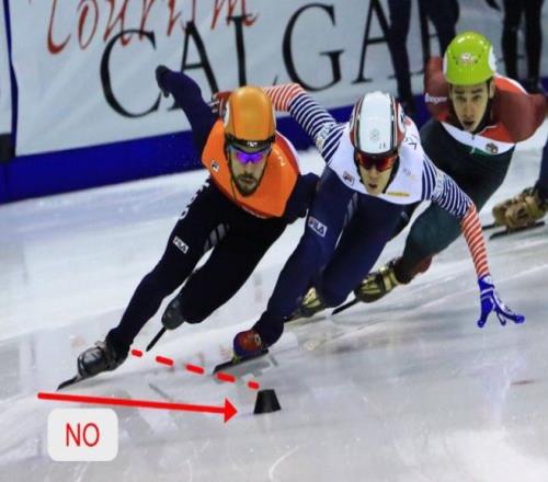 不過,到了轉彎處,運動員必須滑到標誌塊外側,不然就“抄近道”了,會被判脫離賽道。如果兩人並肩滑在藍線內外兩側,接近彎道時,內側運動員為了繞過標誌塊,向外滑時碰到了外側運動員,內側運動員可能受罰。