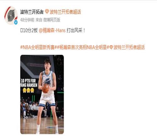 北京時間2月14日,楊瀚森的首次NBA全明星周末之旅,他8分鍾5中4得到10分2籃板,雖然無緣晉級全明星新秀賽決賽,但表現已經足夠出色,開拓者官方也是稱讚“打出風采”。楊瀚森賽後回應最喜歡自己的那記外線三分,自嘲自己的中式英語讓大家很開心,還表示最喜歡的全明星部分是與偶像約基奇聊天,甚至是等不及要親約基奇。