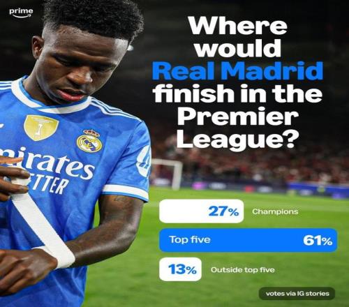 皇馬作為足壇的頂級豪門,在西甲聯賽大部分時間裏都是在和巴薩競爭聯賽冠軍的位置,如今英超聯賽關注度提升,影響力和收入都是足壇第一聯賽,自然也有球迷好奇皇馬如果去到英超能排在第幾的位置。轉播商亞馬遜發起了一次球迷調查,就問了球迷這個問題,現在的皇馬去英超能排在第幾?從投票結果來看,隻有27%的球隊認為皇馬能夠奪冠,61%的球迷認為皇馬能夠排在前5,也有13%的球迷認為皇馬拿不到歐冠名額。