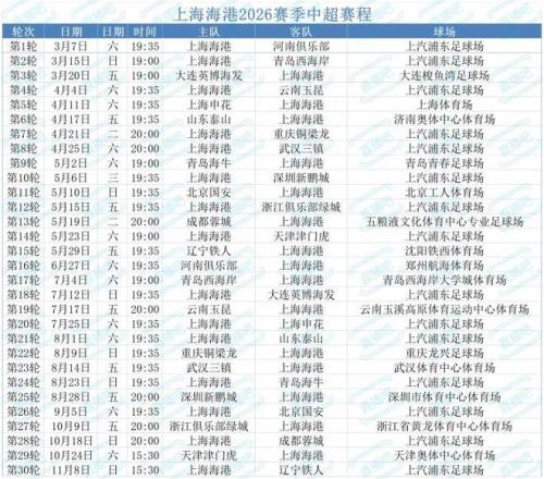 上海海港隊中超賽程。