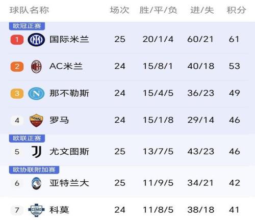 全場比賽結束,國米3-2絕殺擊敗尤文,豪取意甲6連勝。此役過後,藍黑軍團25輪積61分穩居意甲榜首,第二名米蘭少賽一輪積53分,領先多達8分,聯賽爭冠格局愈發明朗!