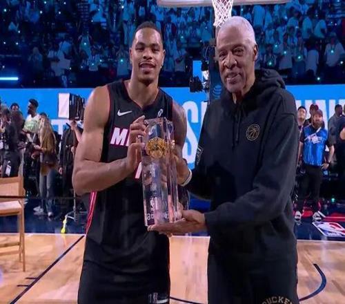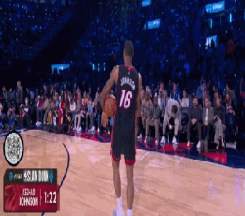 首輪最大的亮點是熱火的約翰遜,這哥們兒不知道從哪請來了灣區說唱老炮E-40。老頭往籃下一站,約翰遜直接起飛,飛躍這位60歲大爺的同時,最後摸著後腦勺單手扣進,47.4分。