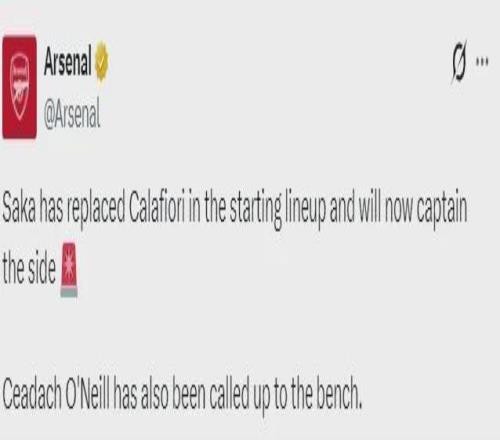 阿森納官推確認,薩卡取代卡拉菲奧裏進入了首發陣容,並且擔任隊長,小將奧尼爾進入了替補席。
