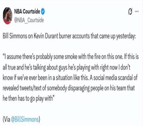 美媒曬出了疑似杜蘭特小號的一些言論,當然,目前沒有實質證據可以證明這些賬號的內容就是杜蘭特發的——