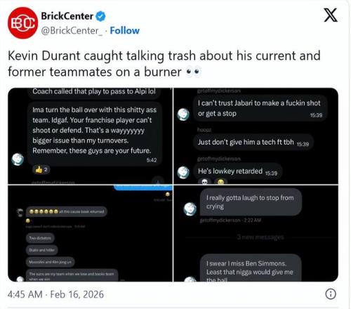 杜蘭特職業生涯裏從不缺爭議話題。這位37歲的球星參加了本周末的全明星冠軍賽,他與勒布朗-詹姆斯、科懷-萊昂納德一同入選美國條紋隊。但這支老牌巨星戰隊最終在決賽中以21‑47慘敗給美國星辰隊。不過,杜蘭特卻因為負麵消息繼續霸占熱搜。