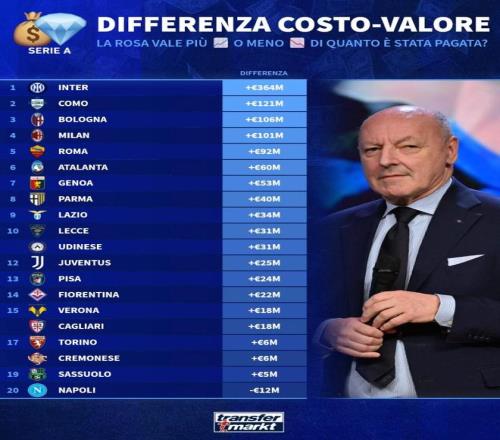 北京時間2月17日,德轉統計出了意甲20支球隊構建陣容的成本與現有價值的差價排行榜,國際米蘭以增長3.64億歐元高居第一,那不勒斯則是唯一負增長的球隊,排名墊底。