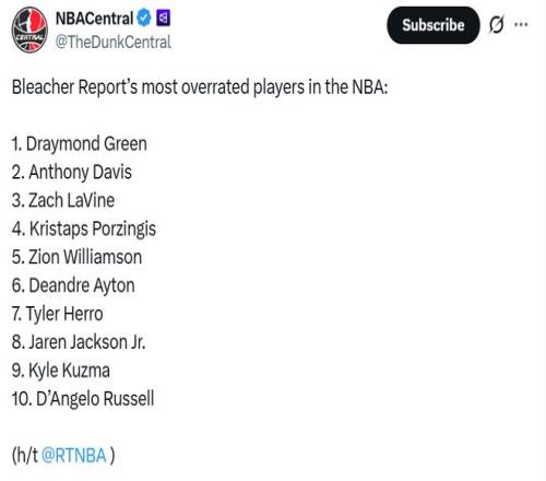在全明星周末短暫的休息期之中,美媒《RTNBA》結合本賽季上半程最新表現評選出現役最被高估球員TOP10名單,其中前五中勇士隊獨占兩席,濃眉哥則高居第二。