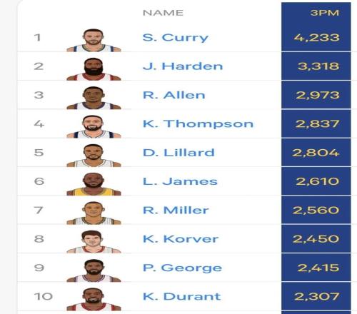 目前的NBA曆史三分榜上,現役球員占了7位,其中前四分別就是庫裏、哈登、湯普森、利拉德。