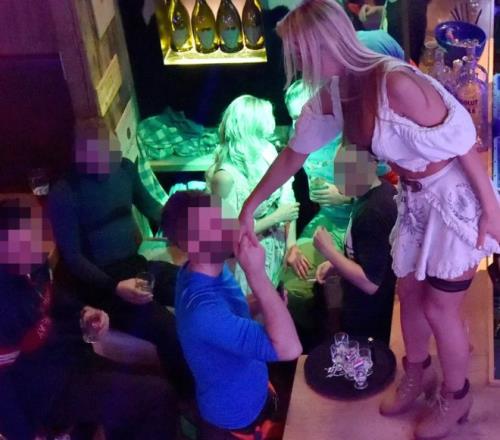傍晚雪場的人陸續回小鎮,霓虹燈一亮,酒吧音樂震得人耳朵發顫。有家昏暗酒吧裏,一個中年英國男刷信用卡點了兩大瓶香檳,遞一瓶給旁邊妝容精致的姑娘,姑娘湊上去親昵回應;另一邊,兩個姑娘在起哄聲中親吻,換更多酒水——酒錢全是周圍男的付。