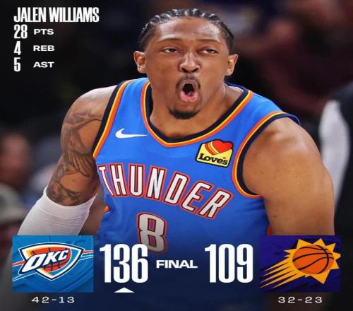 時間回到全明星之前,雷霆對陣太陽的比賽,這場亞曆山大、米切爾缺席,然後雷霆後場當家球星傑威打出了非常出色的表現: