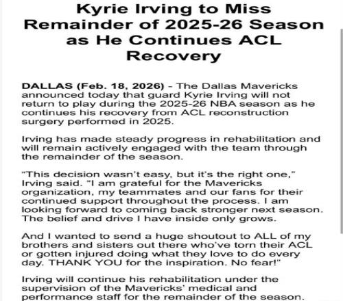 北京時間2月18日,當名記Shams報道表示,歐文本賽季不會複出,隨後獨行俠官方確認,歐文將於2026-27賽季複出回歸賽場。在獨行俠交易送走濃眉哥後,本賽季已經確定繼續重建,因而歐文複出已經沒有意義。
