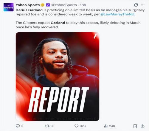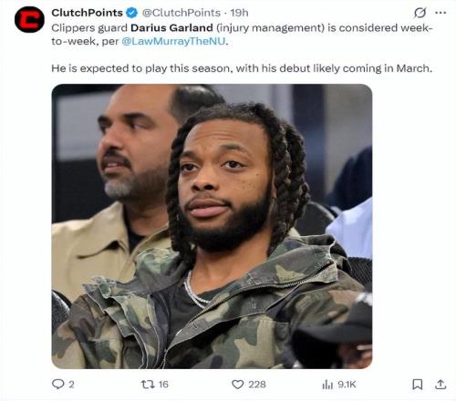 北京時間2月19日,根據快船記者勞裏-穆雷的報道,達柳斯-加蘭目前還無法進行對抗訓練,他的腳趾還在康複中,他腳趾手術的傷口還沒有愈合,所以他的複出時間還需要視每日的觀察而定,預計加蘭最快也要三月份傷愈後首次登場。