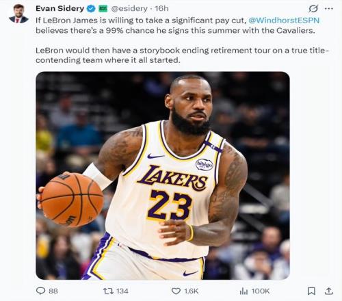 北京時間2月19日,ESPN記者布萊恩-文霍斯特與 《福布斯體育》記者埃文-斯迪瑞紛紛報道,勒布朗-詹姆斯隻要願意接受大幅度的降薪,他重返克利夫蘭騎士隊的概率將得到99%,因為傳奇詹姆斯在克城退役巡演是全世界球迷的期待。