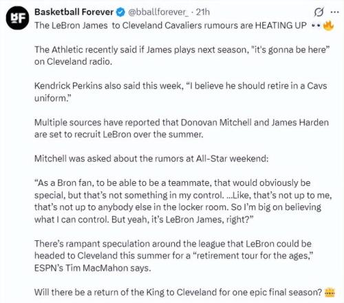 美媒TA也認為下賽季詹姆斯一定會重返克利夫蘭,米切爾、哈登也會在今夏招募詹姆斯,美記蒂姆-麥克馬洪透露詹姆斯今夏可能重返克利夫蘭開啟一場‘史無前例的退役巡演’。