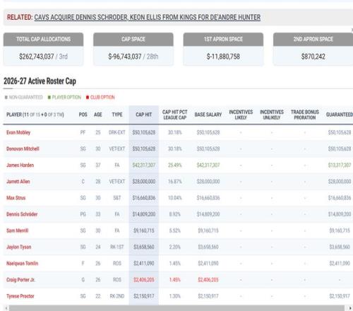 而且根據CBS的報道,詹姆斯重返騎士隊有三種方式,第一種就是最簡單的底薪加盟,騎士隊2026年有28順位簽,騎士隊下賽季保障名額就是12人,預計騎士將超過第二土豪線200萬(還沒算續約埃利斯;)