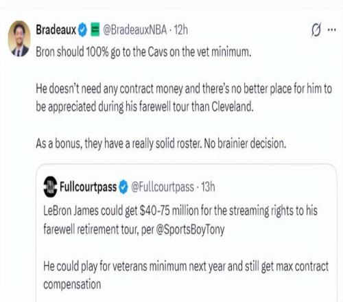 休媒Bradeaux寫道:詹姆斯絕對應該以底薪加盟騎士,他不需要任何的高薪,因為他在克利夫蘭舉行退役巡演是眾望所歸,此外騎士隊的陣容非常強大,他重返騎士是一個再明智不過的決定。