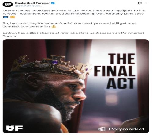 根據BF的報道,詹姆斯的退役巡演流媒體播放版權可能會賣到4000萬至7500萬美元,所以就算詹姆斯以老將底薪重返騎士,那麽他仍然能獲得比肩頂薪的待遇。