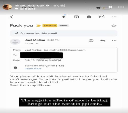 北京時間2月21日,NBA球員拉塞爾-威斯布魯克的妻子妮娜-威斯布魯克分享了她在丈夫周四晚比賽後收到的一封來自球迷的惡毒電子郵件。