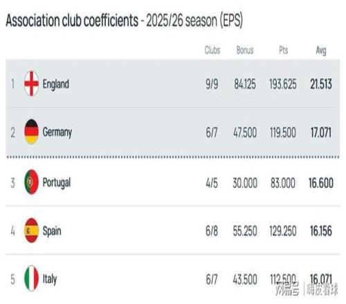 歐足聯公布了最新的積分榜,英超以21.513分排在第一,領先第二名的德甲超過4分。葡超、西甲和意甲分別排在第三到第五名,除了英超之外,前5名的積分差距不到1分,競爭相當激烈。第6名的波蘭隻有14.125分,第7名的法甲隻有14.035分,落後比較多,基本上沒有機會進入前兩名。