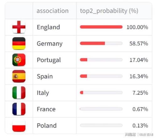 根據專業足球數據機構Football Meets Data的分析,英超已經百分百確定前兩名,德甲獲得另外一個獎勵名額的機會也超過五成。目前,德甲隻有法蘭克福在歐冠出局,拜仁慕尼黑、弗賴堡和美因茨均直通16強,勒沃庫森、多特蒙德和斯圖加特附加賽首回合均至少手握兩球優勢,因此保住第二名的希望是很高的。