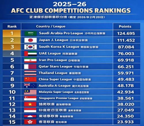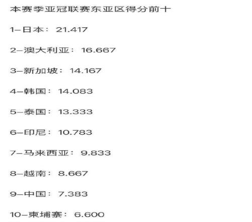 在2025-26賽季,中超球隊僅獲得7.383分的亞冠技術積分,在東亞區排名第9位,低於泰國(13.333分)、印尼(10.783)、馬來西亞(9.833)、越南(8.667)、新加坡(14.167),更是遠遠低於日本(21.417)、韓國(14.083)。7.383分,讓中超排名亞足聯第15位,在東亞區則排名第9位,僅比排名第10位的柬埔寨(6.600)多出不到1分。