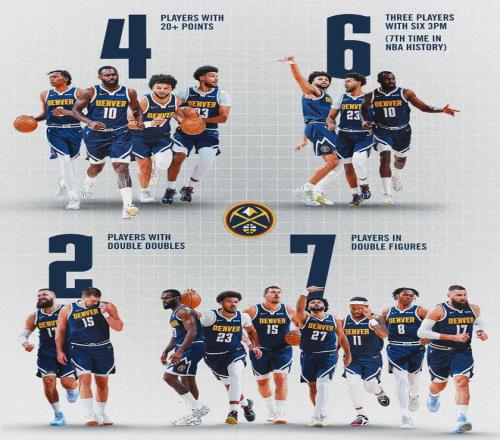 掘金兩個首發缺陣:阿隆-戈登和佩頓-沃特森都沒打。本賽季掘金場均120.9分,高居聯盟第一;進攻效率123.8,同樣是聯盟第一;投籃命中率49.6%,聯盟第二;三分命中率39.6%,聯盟第一;場均罰球命中數21.1,聯盟第二。