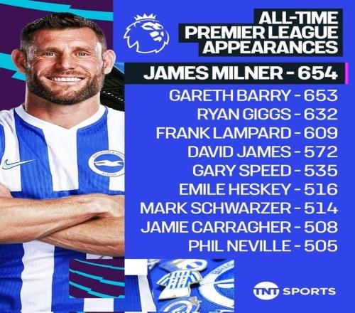 英超第27輪,布萊頓客場對陣布倫特福德,40歲的老將米爾納首發出場,他也以654次出場超越加雷斯-巴裏,正式創造英超曆史出場紀錄!