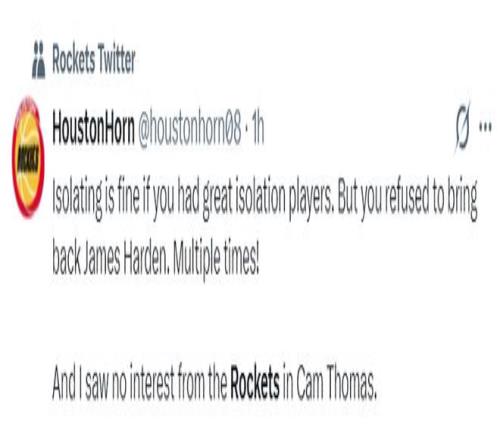 休媒:如果火箭有很多防守出色的球員那麽采取這樣的戰術無可厚非,但如今火箭防守端也並沒有太出色。你們還執意拒絕哈登回歸甚至不止一次,而且火箭隊還對進攻球員卡姆-托馬斯不感興趣。