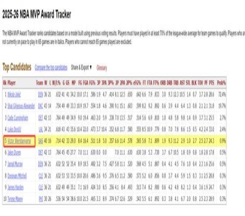 文班亞馬更強悍的地方在於,馬刺隊是西部第二的豪強,這讓文班亞馬的MVP概率排在聯盟第五,僅次於約基奇、亞曆山大、坎寧安、東契奇。從這個角度來看文班亞馬入選最佳一陣幾乎是板上釘釘,隻要文班亞馬出戰超過65場應該就是最佳陣容。