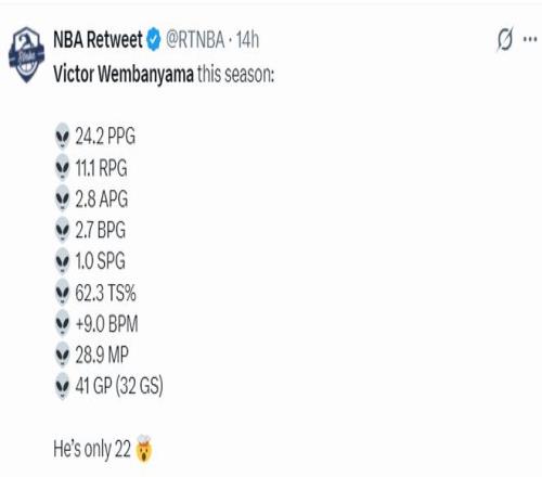 本賽季文班亞馬場均28.9分鍾,拿到24.2分11.1籃板2.8助攻1搶斷2.7蓋帽,命中率51.1%,三分命中率35.7%,真實命中率62.3%,BPM值+9。