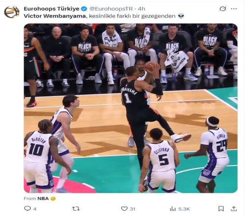 此役文班亞馬海在主場完成了一次持球突破的拉杆掄臂暴扣,裸足2.24米的文班亞馬還能完成如此炸裂的動作讓不少球迷覺得比全明星扣籃大賽還要有趣。