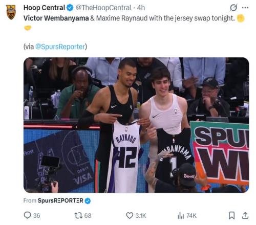 賽後文班亞馬與自己法國國青隊友雷諾互換了球衣。此役文班亞馬29分45秒,20中11,三分5中1,罰球7中5拿到28分15籃板6助攻1搶斷4蓋帽,命中率55%。雷諾則拿到16分12籃板1蓋帽。此役後文班亞馬生涯第545次蓋帽已經升至馬刺隊史第五。