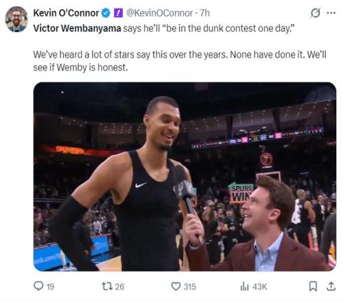 賽後文班亞馬談到自己的掄臂大風車,他表示自己未來有朝一日肯定會參與全明星扣籃大賽。