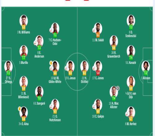 諾丁漢森林首發:27-奧爾特加、5-穆裏略、31-米倫科維奇、34-埃納、3-內科·威廉姆斯、6-桑加雷、8-埃利奧特·安德森(75’20-盧卡)、21-哈欽森(61’29-巴卡瓦)、10-吉布斯·懷特、7-奧多伊(61’14-恩多耶)、19-伊戈爾·熱蘇斯(75’16-多明戈斯)。