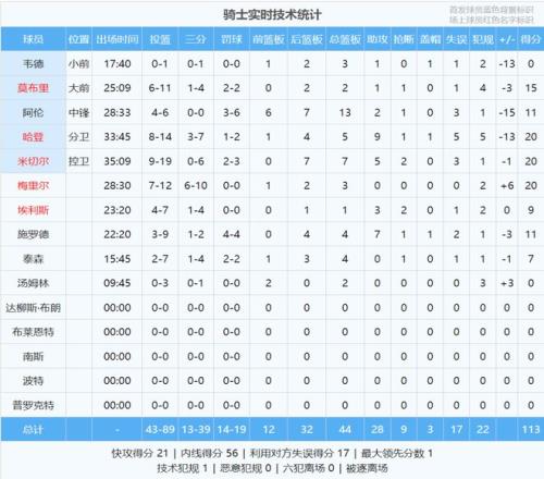 騎士生涯前6場比賽,哈登場均18.7分5板8.7助,投籃命中率50.7%,三分命中率47.1%。米切爾外線失準,今天投籃19中9,三分6中0,罰球3中2,得到20分7板5助2斷3失誤。阿倫6中4拿到11分13板2助,正負值-15全隊最低。