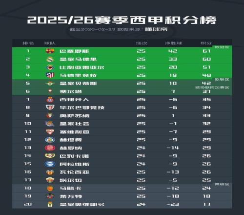 比利亞雷亞爾、馬德裏競技分居積分榜第三、第四,目前身處歐冠區。皇家貝蒂斯排名第五處於歐聯區。排名第六的塞爾塔領先西班牙人2分身處歐協聯附加賽區。