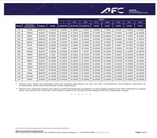 沙特聯賽繼2024/2025賽季登頂亞足聯男子俱樂部賽事排名榜榜首,在2025/2026賽季中期排名榜上繼續領跑。亞足聯表示,此次排名榜的更新依據主要是本賽季亞冠精英聯賽、亞冠二級聯賽繼亞足聯挑戰聯賽的最新戰況。