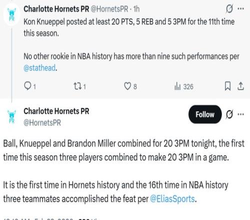 三人恐怖的投射表現也創造隊史紀錄,三人本場合計命中20記三分球,是黃蜂隊史首次有三名球員單場做到這一壯舉,也是NBA曆史上第16次出現,種種跡象都表明,這支擺爛數年無果的超級魚腩黃蜂終於要結束重建重返競爭者行列。
