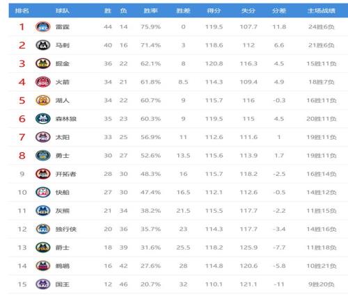 雷霆贏球後2連勝,戰績44勝14負,排名西部第一,領先第二的馬刺3個勝場。