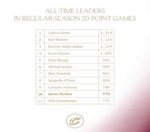 這場比賽哈登迎來裏程碑,他完成772次20+升至曆史第10,排在他身前的安東尼是796場。