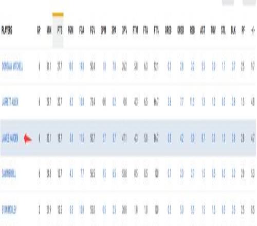 哈登加盟騎士隊的6場比賽,場均32.1分鍾,拿到18.7分8.7助攻5籃板1搶斷0.8蓋帽,命中率50.7%,三分命中率47.1%,罰球命中率86.7%,正負值+4.7。